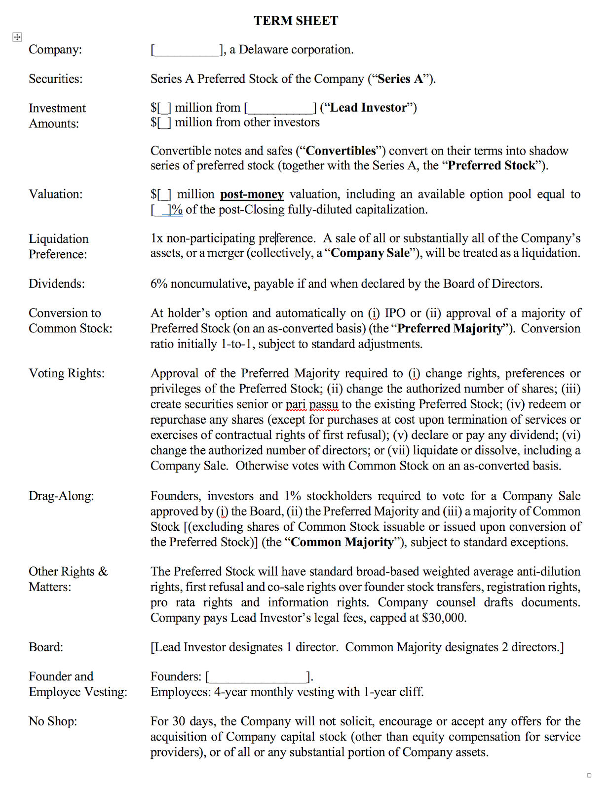 1. Some great investors still send longer term sheets, but this has more to do with their preference for going a bit deeper into the details at this stage, rather than deferring this until the definitive documents. The definitive documents are derived from the term sheet and are the much longer (100+ pages) binding contracts that everyone signs and closes on. It’s common to negotiate a few additional points at this stage, though deviation from anything explicitly addressed in the term sheet is definitely re-trading. Also, in a few places, this term sheet refers to certain terms as being “standard.” That may seem vague and circular, but term sheets frequently do describe certain terms that way. What that really means is that there’s an accepted practice of what appears in the docs for these terms among the lawyers who specialize in startups and venture deals, so make sure your lawyer (and the investor’s lawyer) fit that description.↩